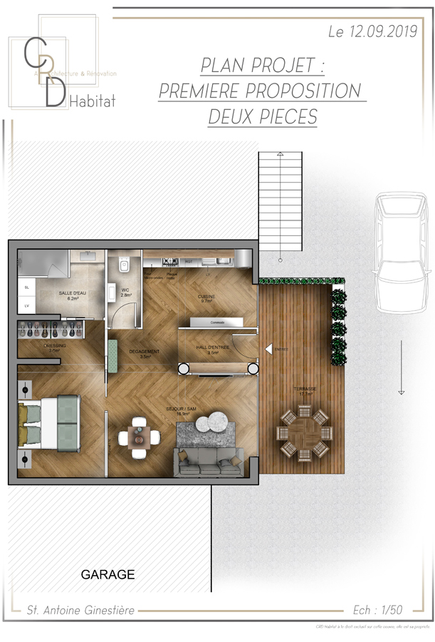 Transformation d’un garage, cave, en un coquet appartement 2 pièces de 56m2 tout confort.